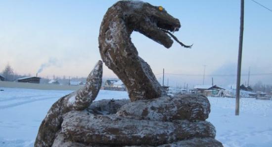 Mikhail a pris l’image du serpent par rapport à l’Année du Serpent dans le calendrier chinois. Âgé de 52 ans, Mikhail Bopposov est un éleveur de bovins et a confectionné sa sculpture à partir des bouses de ses propres vaches. Pour les personnes qui s’inquièteraient de l’odeur, Mikhail précise qu’avec le froid, l’odeur du fumier est annihilée et que le voisinage n’en est donc pas affecté.